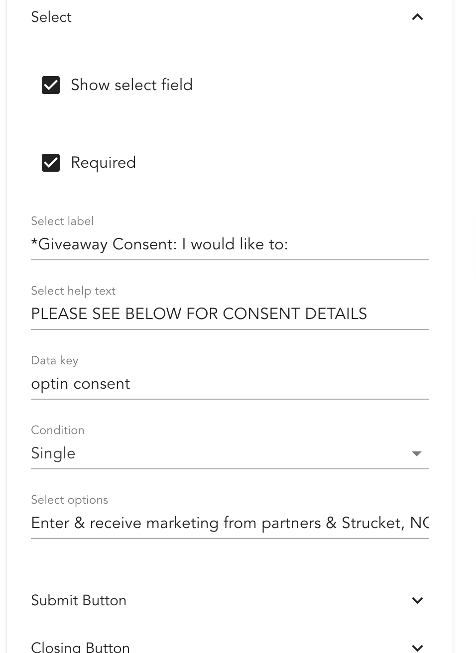 Crucial Step: Include a "Select Data" field to capture specific consent. This allows entrants to choose to enter the giveaway and receive marketing from all participating partners.