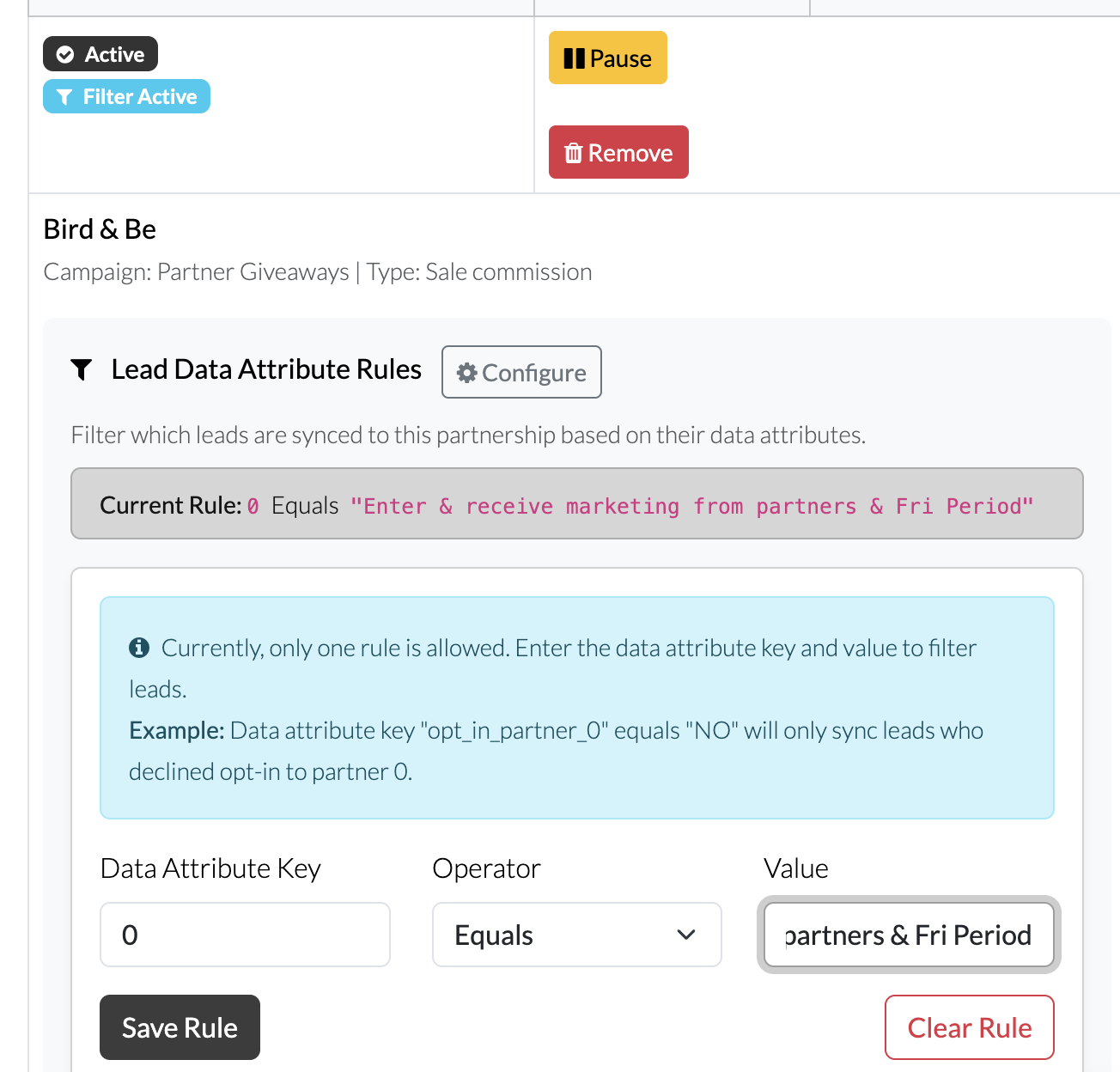 For each partner you are assigning lead data. Enter the rule so that the select data attribute where by they enter and provide consent is the rule applied. Always test this is working correctly before activating your campaign.