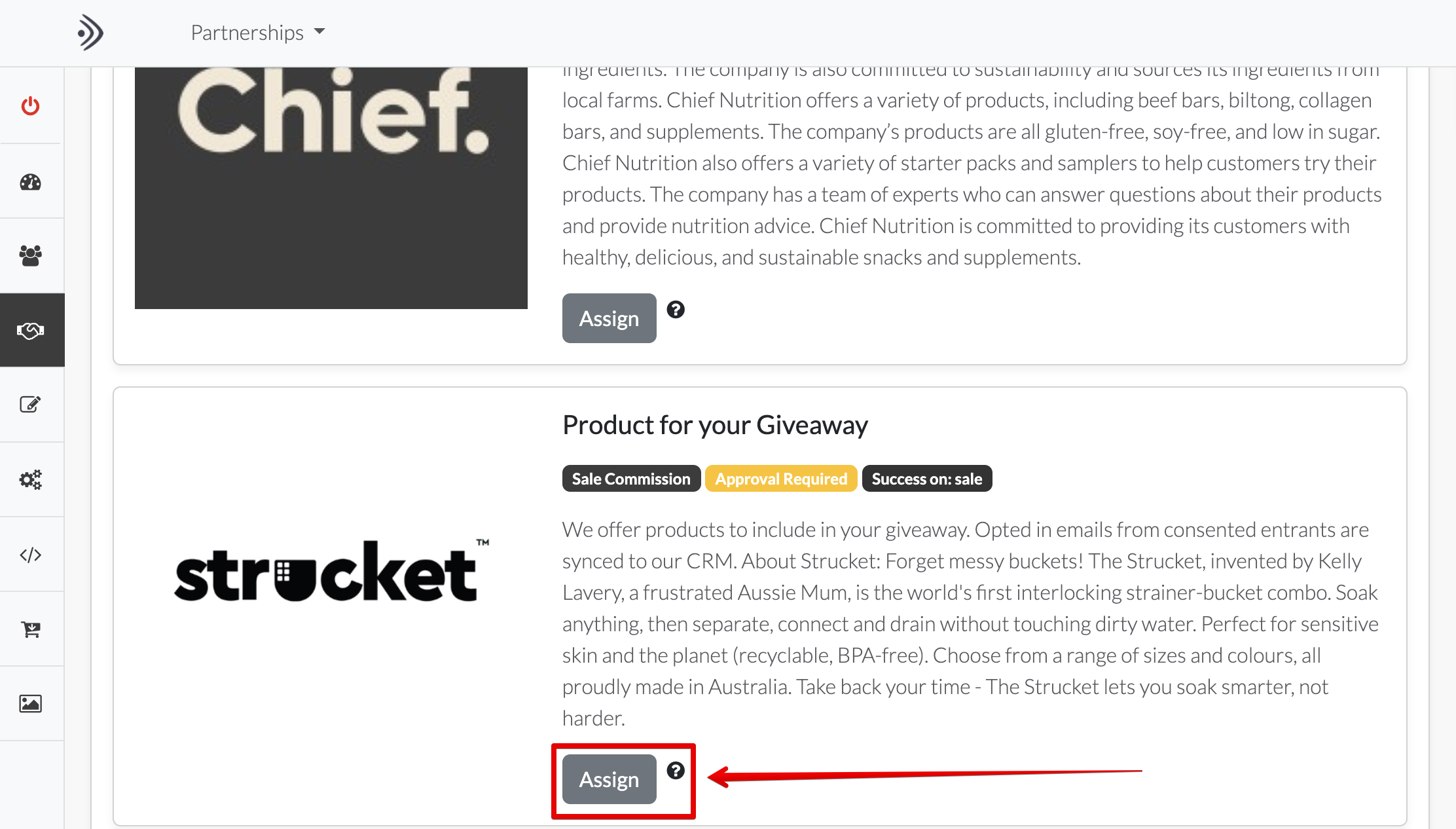 Identify the complementary brands you want to work with and click Assign to send them a request and assign them to your partnership.
